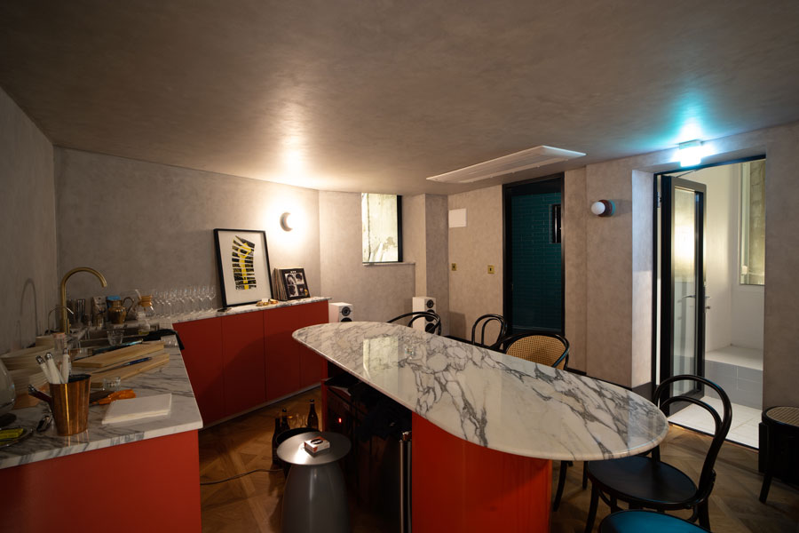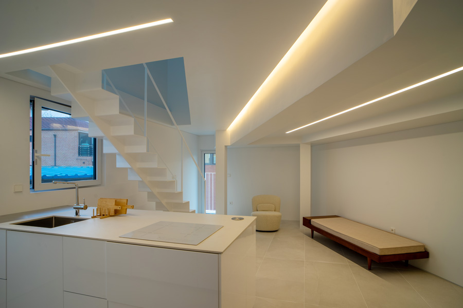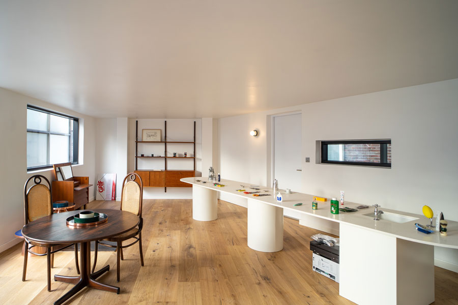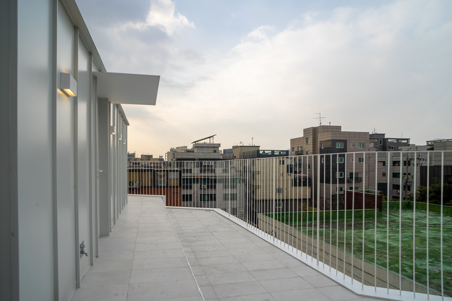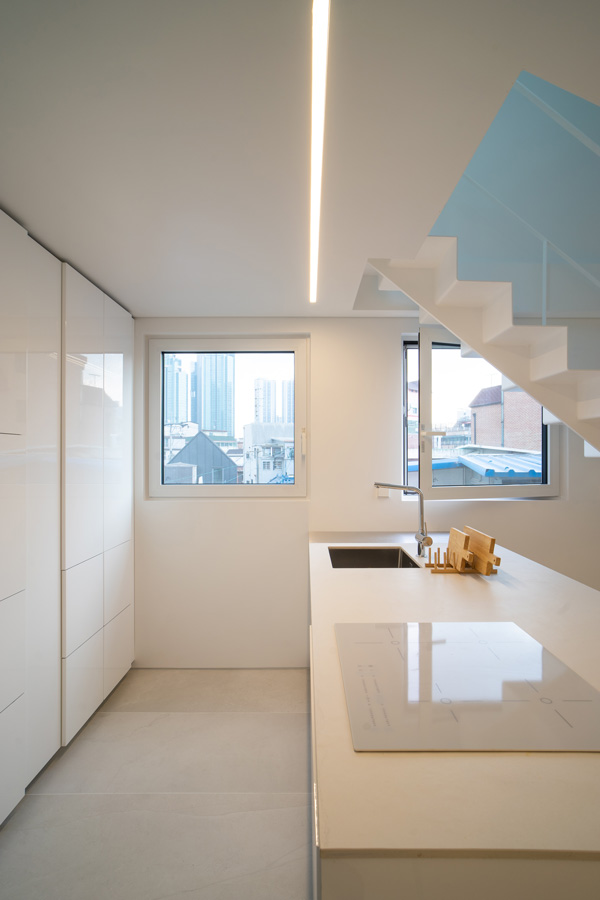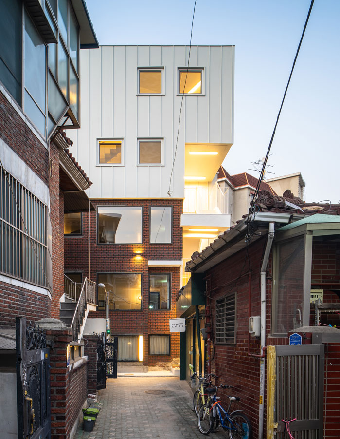다가구주택의 실내 칸막이벽은 모두 해체되고 철골 기둥과 보를 덧대어 보강하였다. 법의 테두리 밖에 있었던 옥탑에 딸린 방은 3층이 되었고, 그 위에 한 개층을 증축하여 2개 층의 주택으로 조성되었다. 증축 부위는 협소한 공지와 골목여건을 고려하여 대부분 건식으로 진행되었는데 지붕에 흔히 사용하는 거멀접기로 이음한 금속재를 벽에도 연장하여 넓지 않은 증축부위의 재료를 단순화하였다. 색상 또한 기존 부위에 적용하는 것은 검은색, 증축하거나 수선한 부분은 백색으로 처리하여 그 영역을 시각적으로도 드러내었다. 빈티지 인테리어가 경제적인 이유 혹은 새로운 미학적 유행이 되었지만, 우리는 실내에 구조재를 드러내지 않는 것이 안에 전시될 제품에 대한 존중으로 고려되었다.
