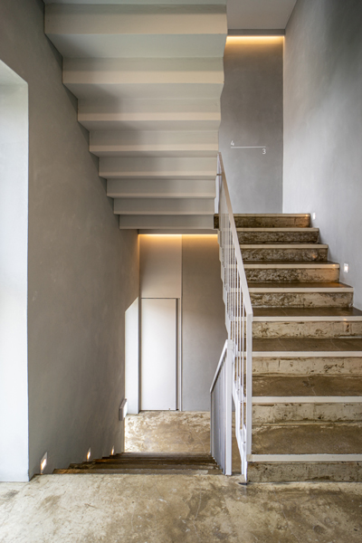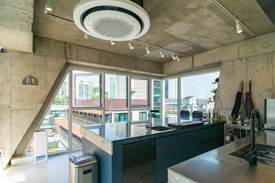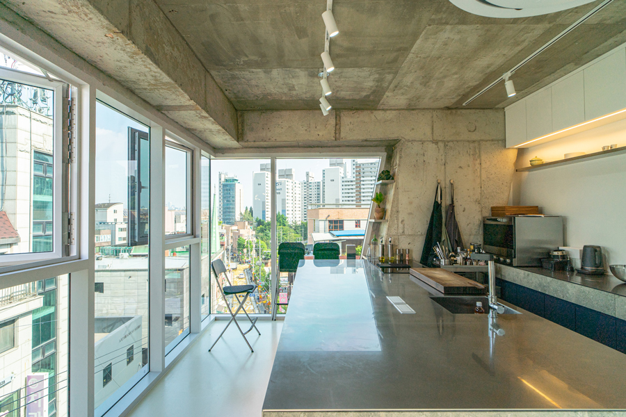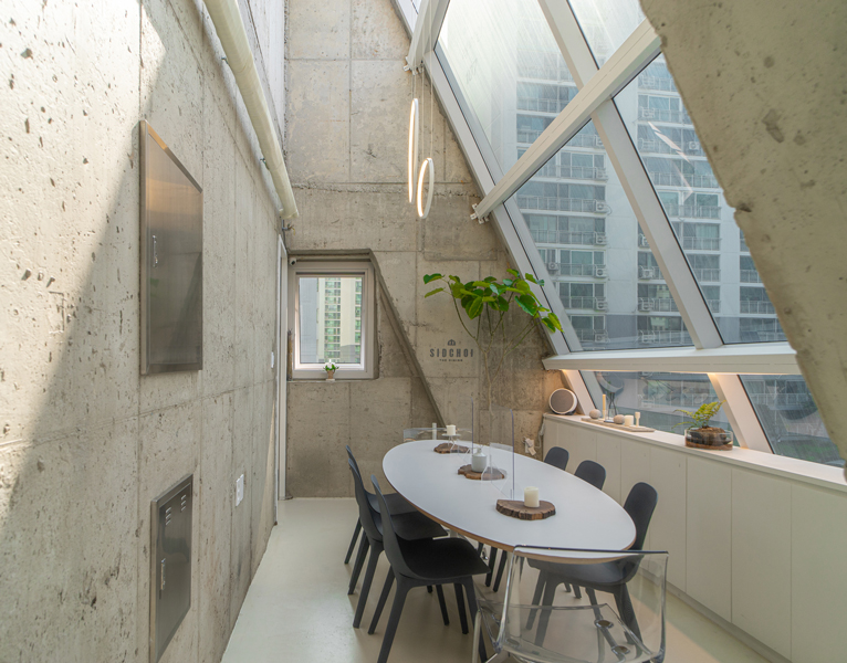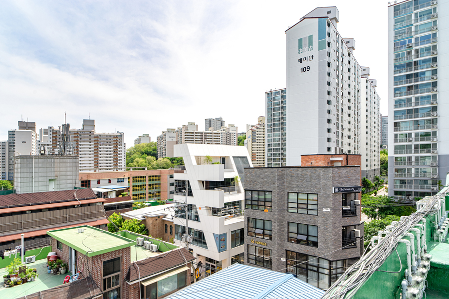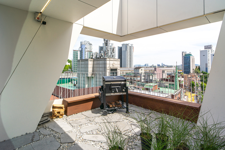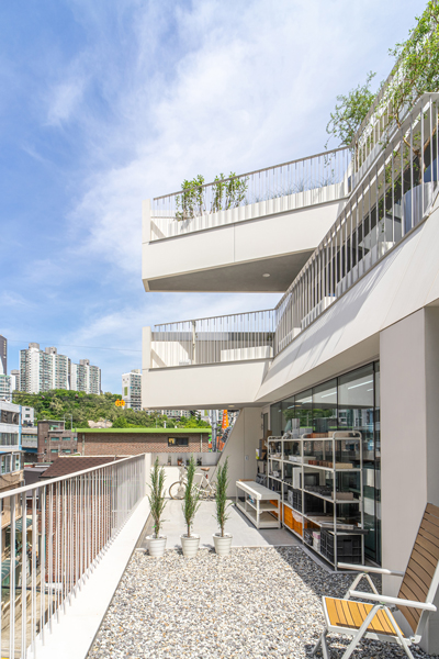 정북 일조 영향을 받지 않는 일부 정면을 최대한 확보하여 협소한 대지이지만 건물의 존재감을 최대한 드러내도록 하였으며, 자연스럽게 생기는 사선 발코니는 내부에서도 다용도 야외 bar 역할을 한다.