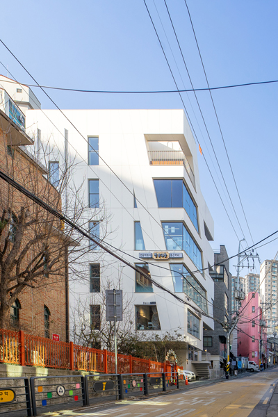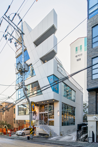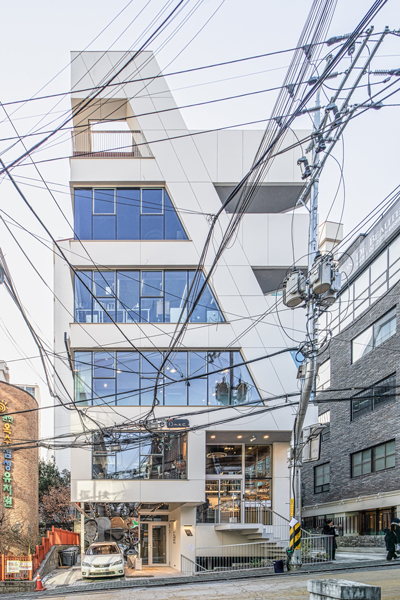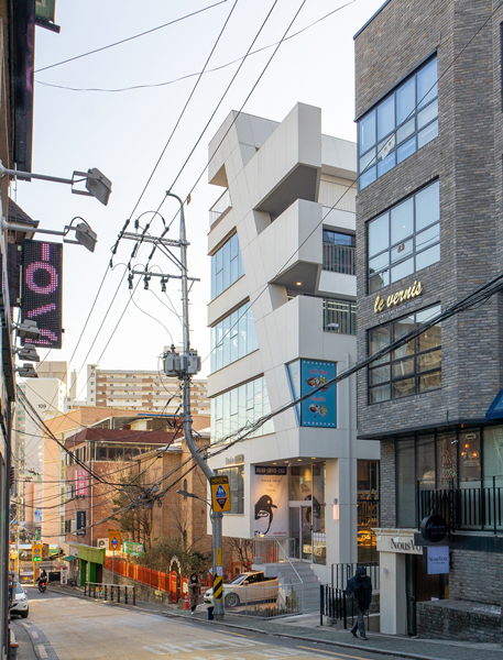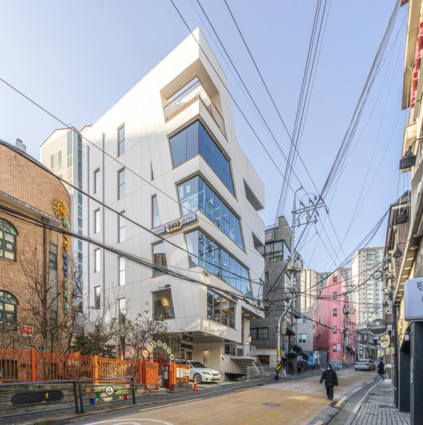오래된 건물들이 모여있는 블록에 새로운 건물의 자연스러운 정박(碇泊)을 위하여 백색의 대형 박판 패널을 적용하였으며, 재료나 면분할이 없이 하나의 매스로 존재하게끔 하였다. 협소한 면적을 최대로 이용하게 위해 내부의 구조 기둥 없이 캔틸레버와 사선의 벽기둥을 계획하였으며, 이는 그대로 입면에 반영되었다.